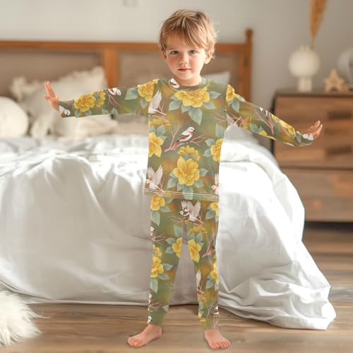 Pajama Sets Long Sleeve Birds Yellow Flowers Pattern Soft Comfy Sleepwear 2 Piece PJS 3-8T 2