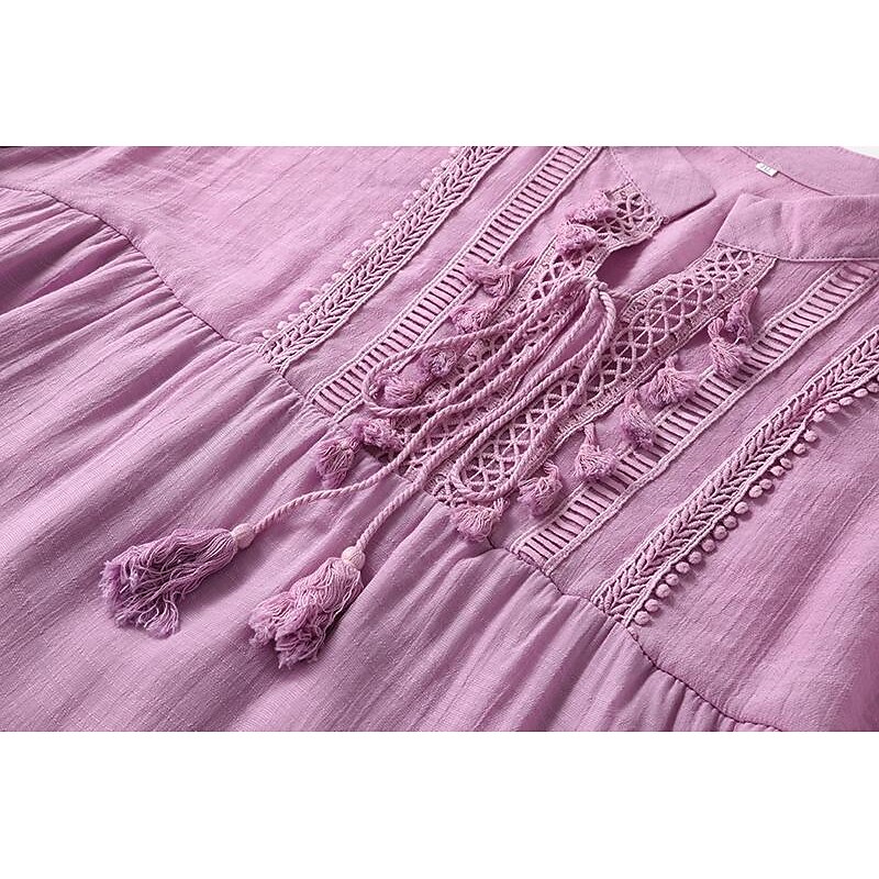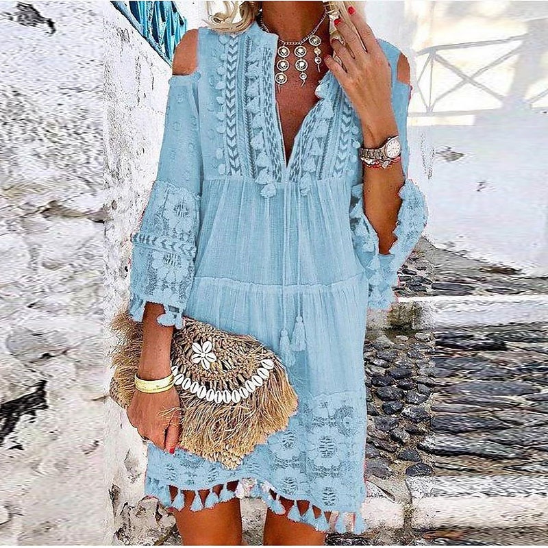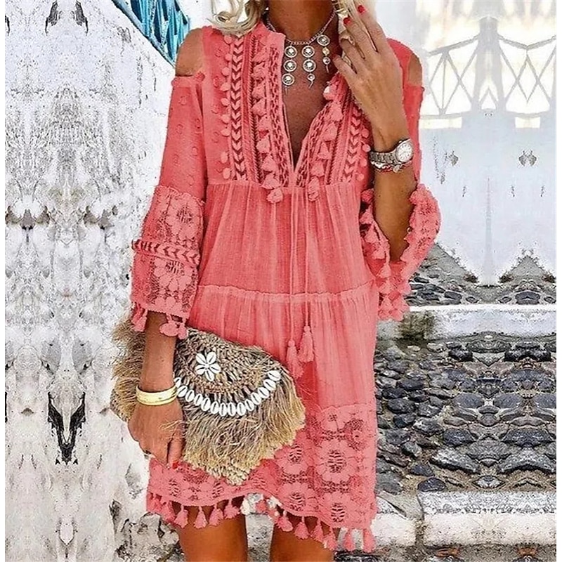 Highlights [Fabric] : Crafted from a delicate lace fabric, this dress blends cotton and polyester, ensuring a lightweight and breathable feel perfect for warm spring and summer days. The micro-elastic quality offers a comfortable fit that adapts to your movements. [Fit & Style] : This dress embodies a loose fit with a shift silhouette, providing effortless comfort and a relaxed, bohemian style. Its versatility allows it to transition seamlessly from casual outings to vacation settings. [Design Highlights] : Featuring a chic V-neckline and a unique cold shoulder design, this dress is adorned with intricate lace detailing along the sleeves and hemline. The tassel fringe and tasseled hem add a playful, boho touch, while subtle floral embroidery enhances its elegance. [Occasions] : Ideal for vacation, holiday gatherings, or casual daily wear, this dress is versatile enough for a variety of outdoor activities. Pair it with statement jewelry for a dressed-up look or keep it casual with sandals for a day at the beach. [Size Range] : Available in a range of sizes from S to 4XL, this dress is designed to accommodate a variety of body types. We recommend selecting one size larger than usual for the best fit.