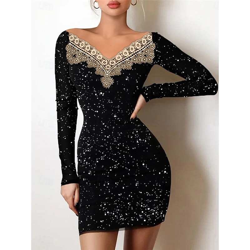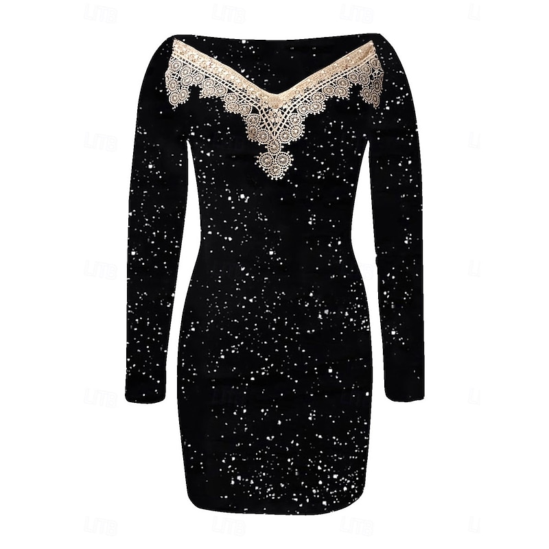 Highlights [Fabric] : This exquisite mini dress is crafted from a combination of stretchy polyester and lace materials that offer a micro-elastic fit, ensuring comfort while maintaining a flattering silhouette. [Fit] : The dress features a form-fitting, bodycon design that elegantly hugs the body, showcasing a regular fit that complements the feminine figure effortlessly. [Design Highlights] : With an off-the-shoulder neckline and delicate lace patchwork, this dress is adorned with exquisite starry patterns for a subtle shimmer. The long sleeves add an extra touch of sophistication. [Occasions] : Perfect for street style, parties, and a variety of special events, this dress is ideal for fall and winter seasons, offering a chic and stylish look suitable for both casual outings and evening gatherings. [Size Range] : Available in sizes M, L, XL, and 2XL, catering to a diverse range of body shapes and ensuring a perfect fit for every woman.