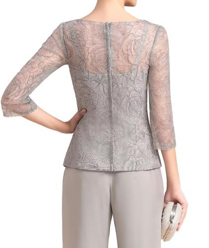 Fabric type: ChiffonCare instructions: Dry Clean OnlyMother of the bride dresses 3/4 sleeves: This stylish ensemble consists of a two-piece outfit made from floral lace and delicate chiffon. The flowing material adds an elegant touch to the overall look.Two-piece outfit for mother of the bride pant suits: The tailored cut accentuates the waistline, enhances the overall silhouette and adds a modern twist to the traditional mother of the bride attire.Formal evening wear for women: The pant suit showcases a classic scoop neck, which suits various face shapes. The neckline frames the face beautifully and adds a touch of femininity to the ensemble.Wedding guest dresses for women plus: The top is adorned with carefully placed sequins and a exquisite brooch. These subtle embellishments add sparkle and glamour without overpowering the overall design.Mother of the bride dresses long sleeve: With 3/4 sleeves, this mother of the bride pant suit provides coverage and warmth, making it suitable for any season or climate. Perfect for everyday use. superior materials and excellent craftsmanship ensure long-lasting durability.