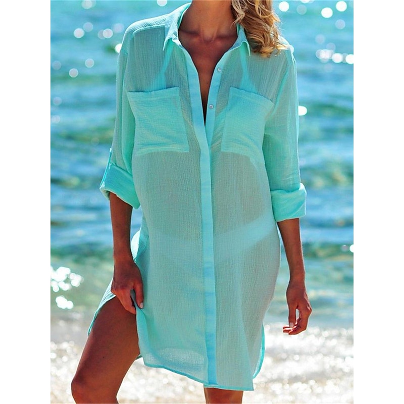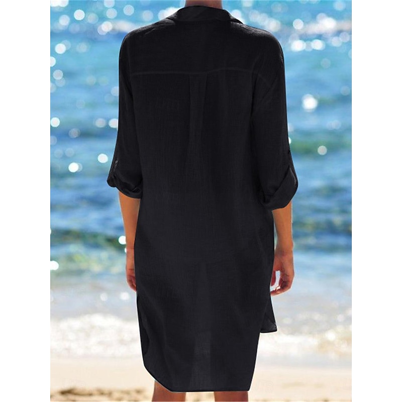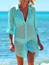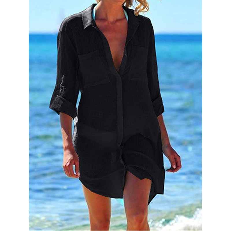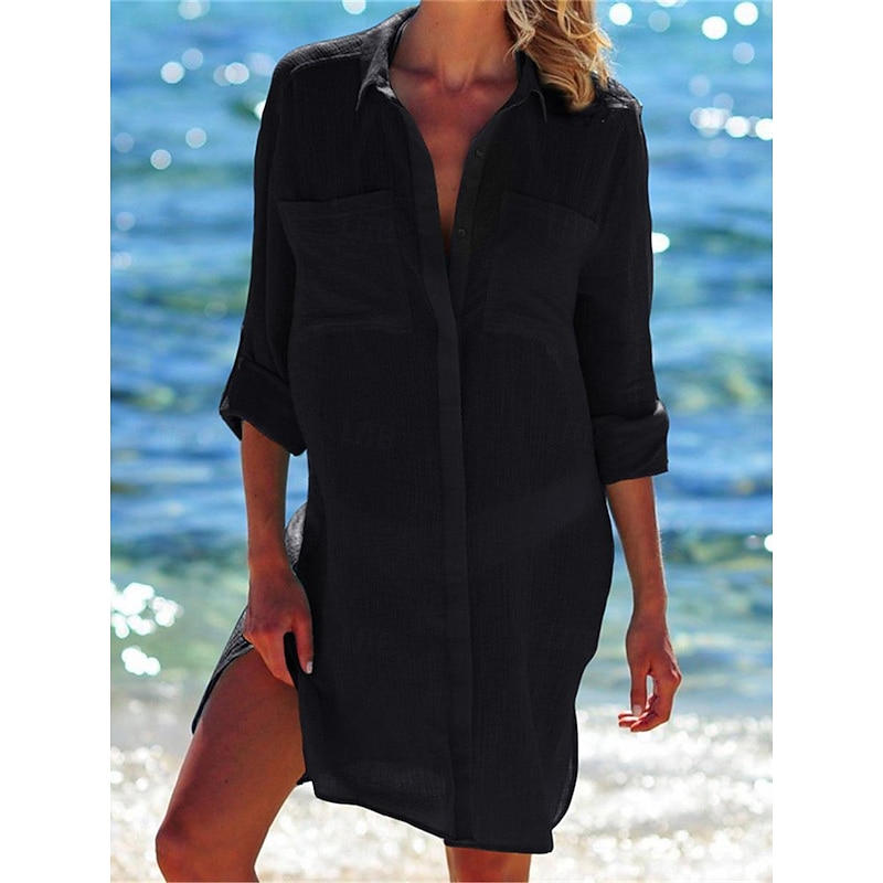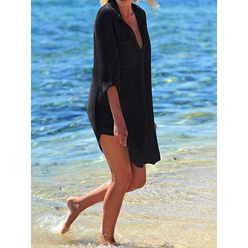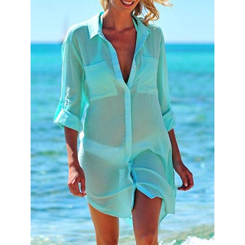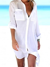 Highlights - Stay chic and cool in this white cover up mini dress perfect for summer - Long sleeves make it versatile for day or night - Loose fit for a comfortable and relaxed look - Pair with your favorite sandals for a vacation-ready outfit - Shirt collar neckline adds a touch of sophistication to your beach look