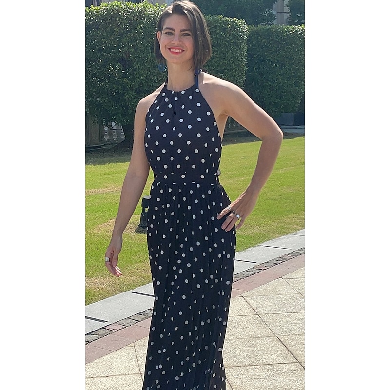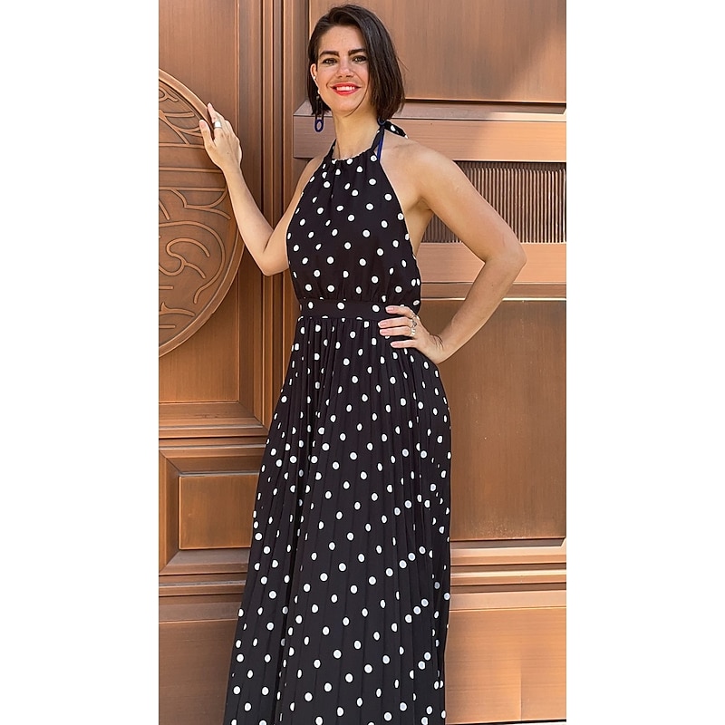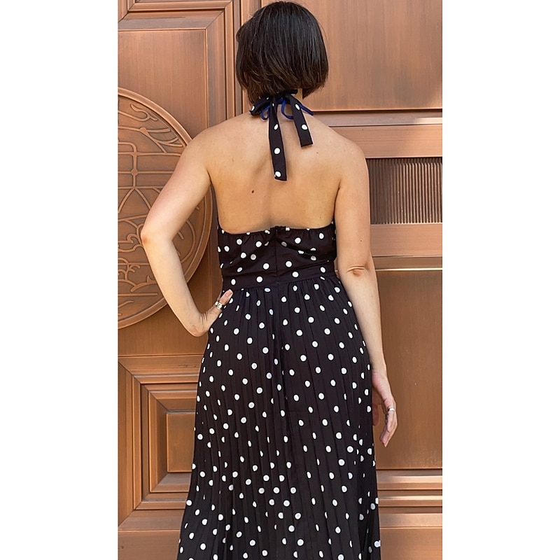 This dress is adorned with a charming polka dot print, adding a playful yet sophisticated element to its vintage elegance. The halter neck and backless design accentuate the shoulders, while the subtle pleats enhance its flowy nature, creating an effortlessly chic look.