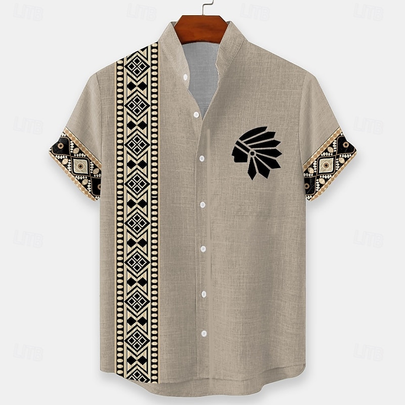 Men's Geometric Indian Ethnic Shirt Button Up Shirt Stand Collar Shirt Short Sleeve Vintage Retro Vacation Dailywear Beach Wear Summer Spring Mandarin Collar 3D Print Linen Like Shirt Yellow Light 3