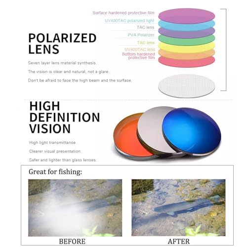 • Durable TAC Polarized Lens - the clearer of vision, the more convenient and safer life. Polarized lens can reduce glares and reflections, increase color contrast, improve vision, reduce eye fatigue and eyestrain. Great for driving, fishing, hiking, golf, etc