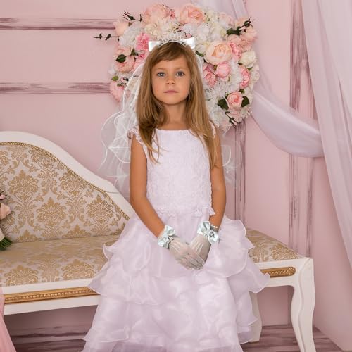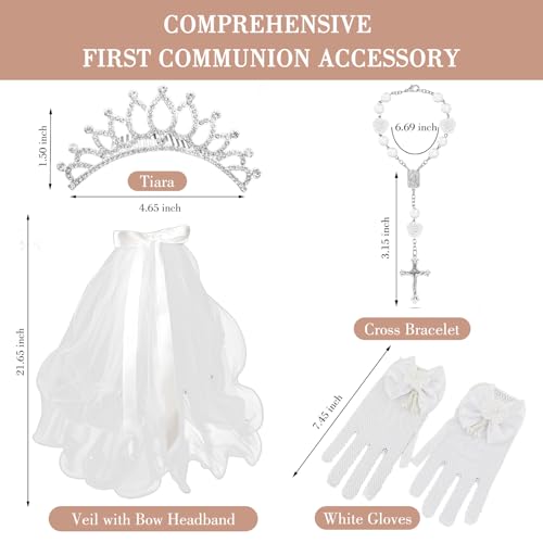 • Comprehensive First Communion Accessory: This girls' First Communion Veils set includes all your little one needs – a tiara, cross bracelet, veil with bow headband, and white gloves – to complement her Holy Communion dress perfectly.