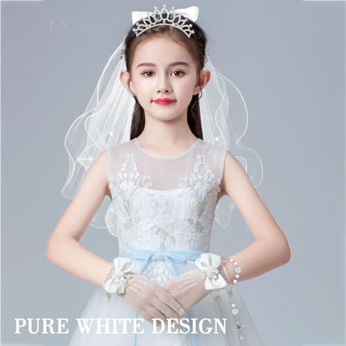 Girls First Communion Veils Set -Tiara,Veil,White Gloves,Cross Bracelet - Holy Communion Dress For Catholic Events Wedding Kids Parties 5