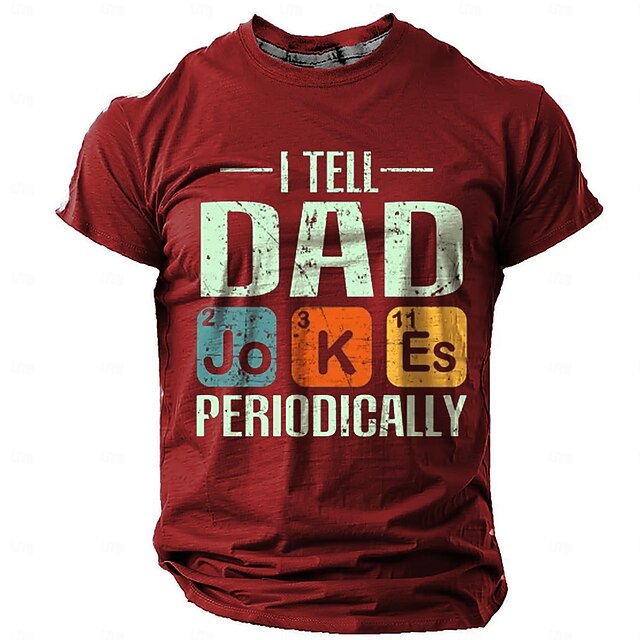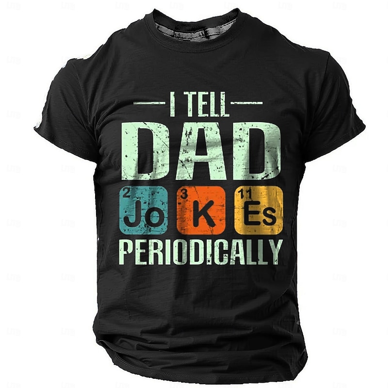 Highlights [Fabric]: Crafted from a high-quality polyester fabric, this men's t-shirt ensures both comfort and breathability, making it a great choice for warmer spring and summer months. The fabric features a micro-elastic quality for easy movement and a relaxed fit. [Fit]: The classic crew neck and short sleeves offer a laid-back and comforting fit, perfect for everyday wear. Its casual style is designed for versatility, easily pairing with jeans or shorts for a stylish casual look. [Design Highlights]: This t-shirt stands out with its clever 3D print that humorously incorporates a periodic table-inspired design. The text "I Tell Dad Jokes Periodically" adds a playful and witty touch, making it a fun addition to any Dad's wardrobe for those who appreciate a blend of science and humor. [Occasions]: Suitable for daily wear or special holidays like Father's Day, this t-shirt is perfect for casual outings, family gatherings, or simply adding some fun to your everyday ensemble. It's also an ideal gift option that combines practicality with a sense of humor. [Size Range]: Available in a variety of sizes from S to XXXL, this t-shirt caters to a broad range of body types, ensuring that every Dad can enjoy this playful and comfortable garment.