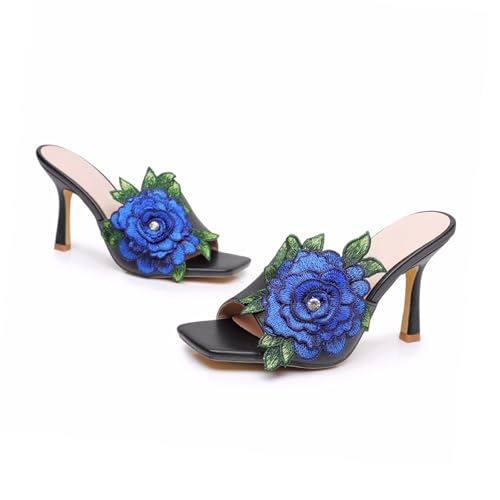 Women Square Toe Stiletto Flower Heels Elegant Floral Embroidered Slip On High Heels Mules Sandals Wedding Party Dress Shoes 6