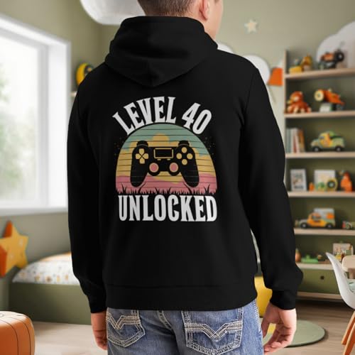 HOT ! Kids Retro Level 40 Unlocked Video Gamer 40th Birthday Gift Boys Girls Lightweight Kangaroo Pocket Fleece Hoodies