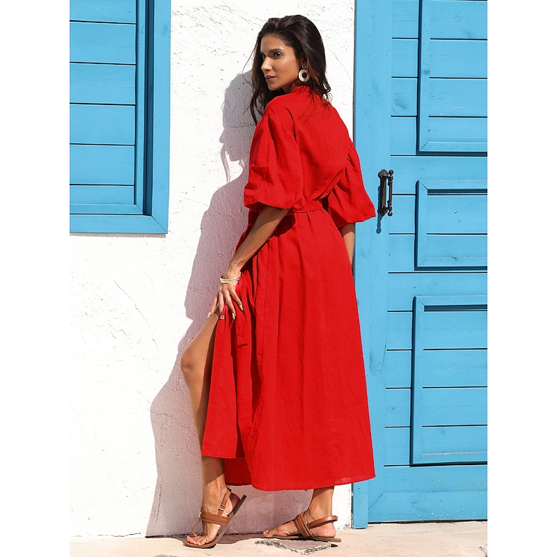 Women's Linen Cotton Shirt Maxi Dress Red Casual Collared Button-Down Loose Fit Puff Sleeve Belted 7