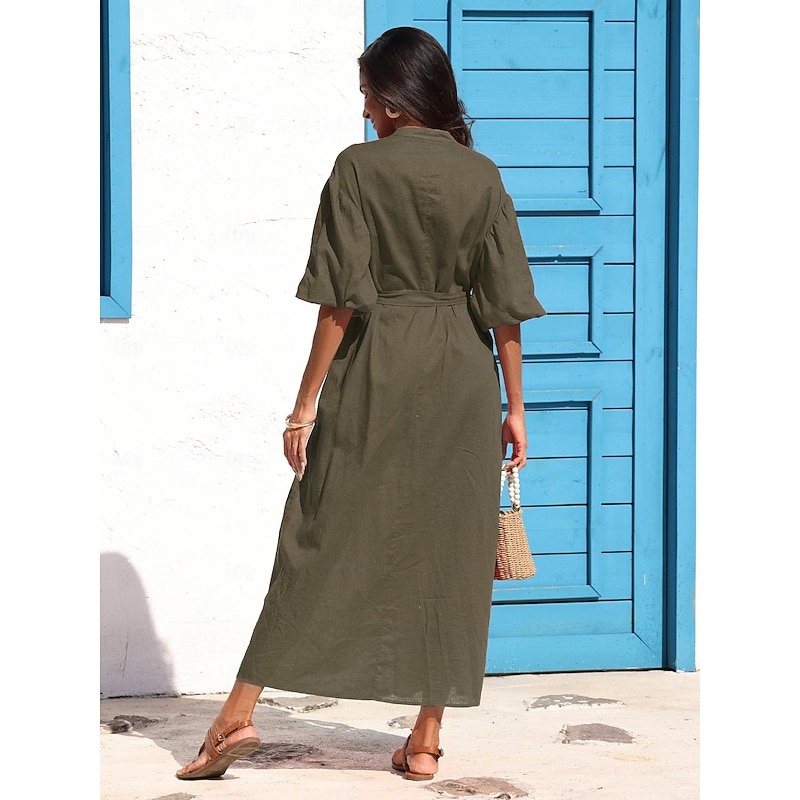 More information about Women's Linen Cotton Shirt Maxi Dress Red Casual Collared Button-Down Loose Fit Puff Sleeve Belted