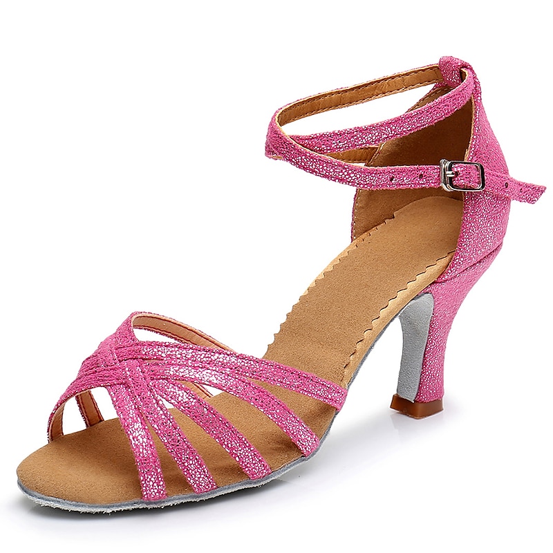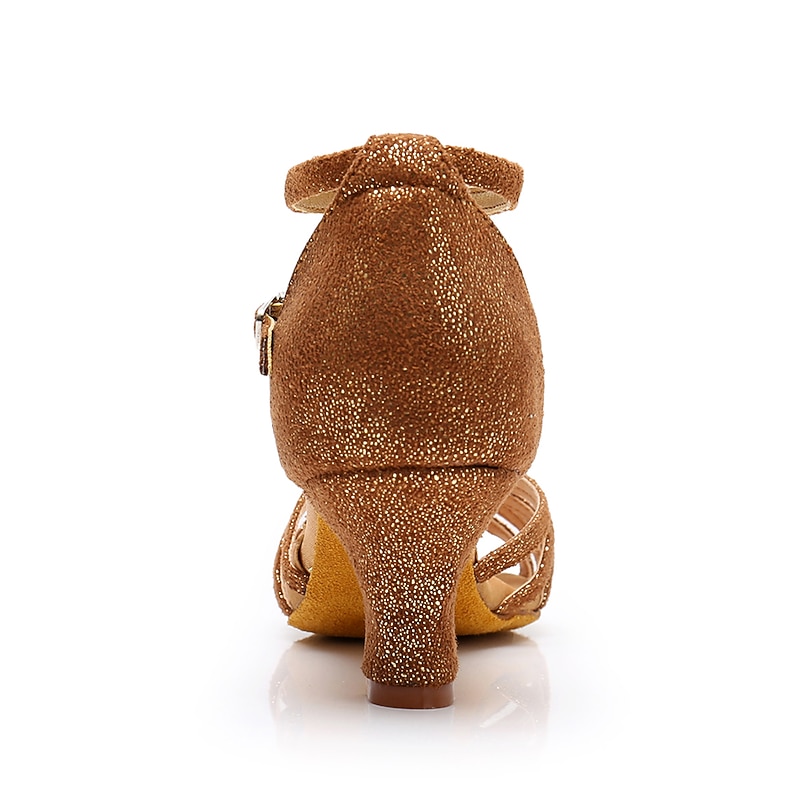 Designed with a strappy open-toe style, these shoes feature a classic ankle strap with a buckle closure. This design allows for an adjustable, secure fit that offers both stability and comfort, ensuring that the shoes stay in place during intricate dance moves.