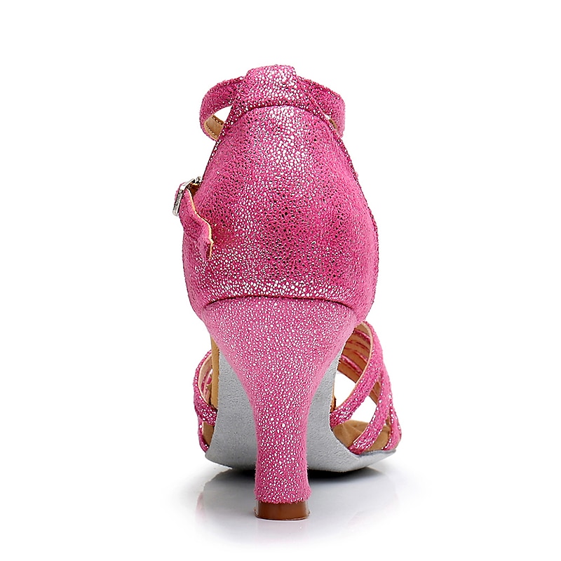 The shoes are adorned with sparkling rhinestones or glitter, adding a glamorous touch that catches the light beautifully. The mid-height Cuban heel offers a perfect balance between elegance and stability, making it ideal for executing dance moves with confidence.