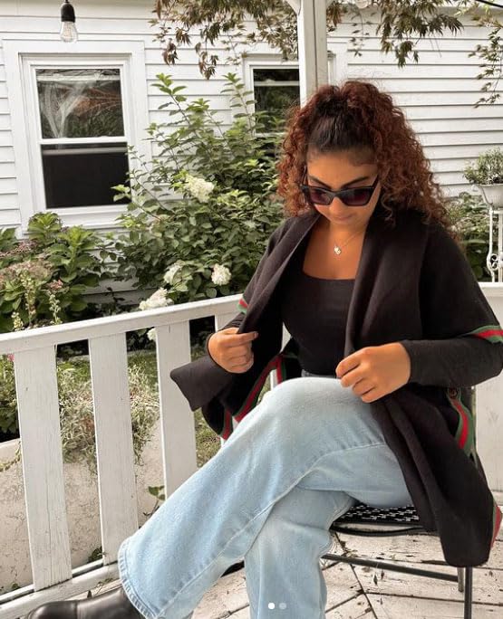Amelia Classic Black Poncho Wrap: Versatile Open-Front Shawl with Red & Green Striped Trim – Layered Ruana for Women 5