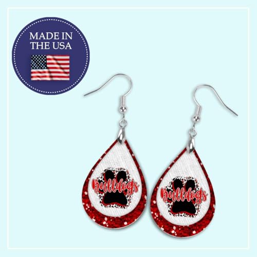 Quality Design WeightThese red and white Bulldogs teardrop earrings are 1.5 long and 1 wide for the actual teardrop and 1/8 thick. The earrings hang about 2.25 long from the top of the earwire.The Bulldogs pawprint earring design is only printed on one side of the wood material. The back is plain brown. The earrings are made with a exclusive engineered wood that has a glossy surface and wood backing. Each teardrop is cut to precision and the image is directly printed on the front glossy surface. The edge has a nice charred finished. No cork, cardboard, glitter, vinyl or stickers are used in our production.The earrings are made with stainless steel, silver-colored earwires with rubber stoppers. Packaged in a chic organza gift bag and ready to send directly to your recipient.each of our earrings are made in our studio and proudly Made in the USA!Check out our Amazon store for more color options or send us a message to create something unique for you!