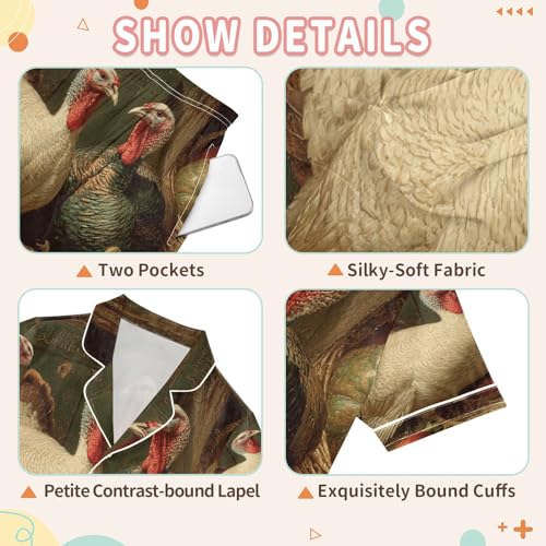 Satin Pajama Sets Short Sleeve Vintage Turkeys Fall Button Down Silky Nightwear 2 Piece PJS 5-14Y