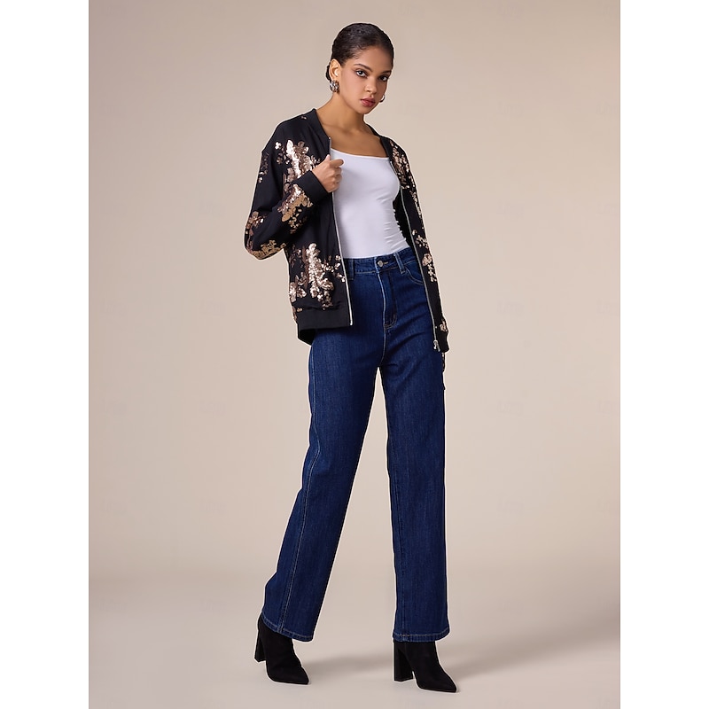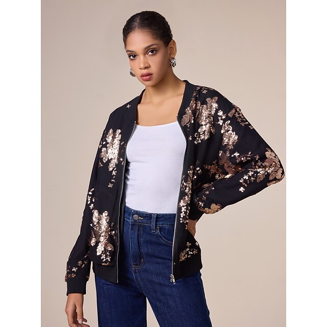 Women's Bomber Jacket Sequin Crew Neck Casual Party Evening Fall Winter 2