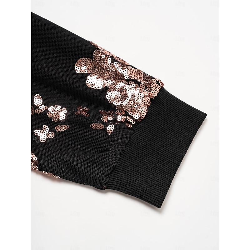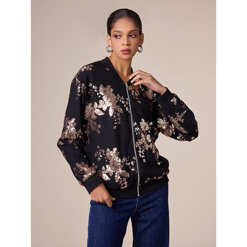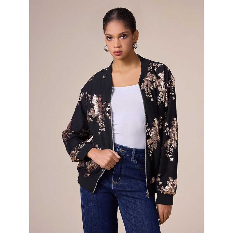 Women's Bomber Jacket Sequin Crew Neck Casual Party Evening Fall Winter 1