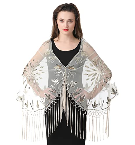 Women's Glittering Scarf Mesh Sequin Wedding Cape Fringed Evening Shawl Wrap for Wedding Evening Dresses Beige
