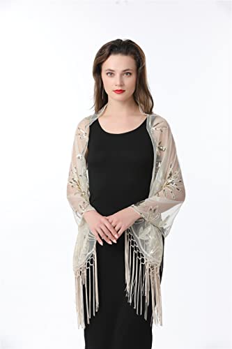 Women's Glittering Scarf Mesh Sequin Wedding Cape Fringed Evening Shawl Wrap for Wedding Evening Dresses Beige 7