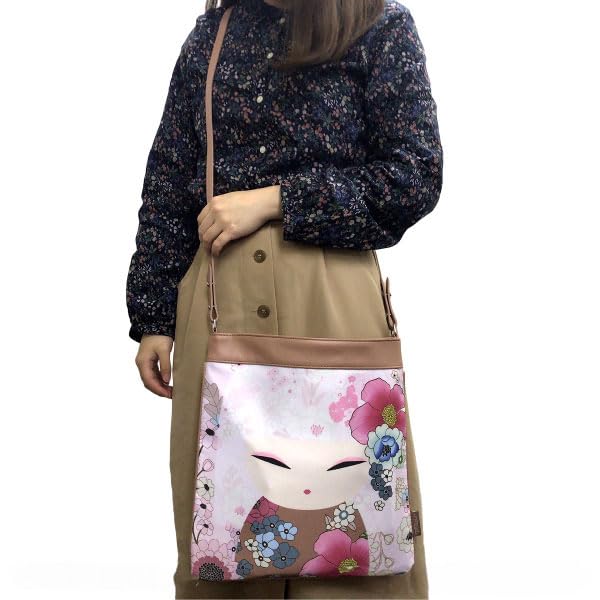 • This is a large shoulder bag printed with a Kimmidoll design. The interior features a convenient pocket for storing small items such as tissues and a smartphone. The Kokeshi dolls in the design are named after Japanese women.