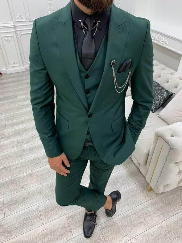 Mens 3 Piece Suits Slim Fit Wedding Business Party Prom Solid One Button Peak Lapel Blazer Vest & Pants Suit Set 7