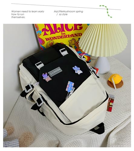 Kawaii Backpack Large Capacity Cute Women Backpack with Pins Waterproof Nylon Travel Bag Men Solid Color Backpack (Black) 6