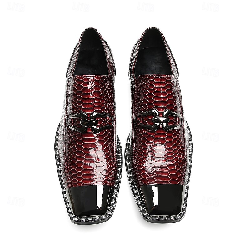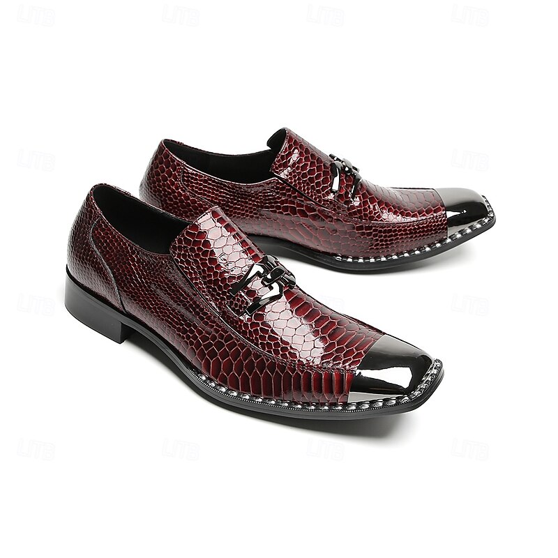 Men's Genuine Cowhide Leather Burgundy Snake Pattern Slip-On Loafers with Metal Buckle – Elegant Party and Evening Dress Shoes 1