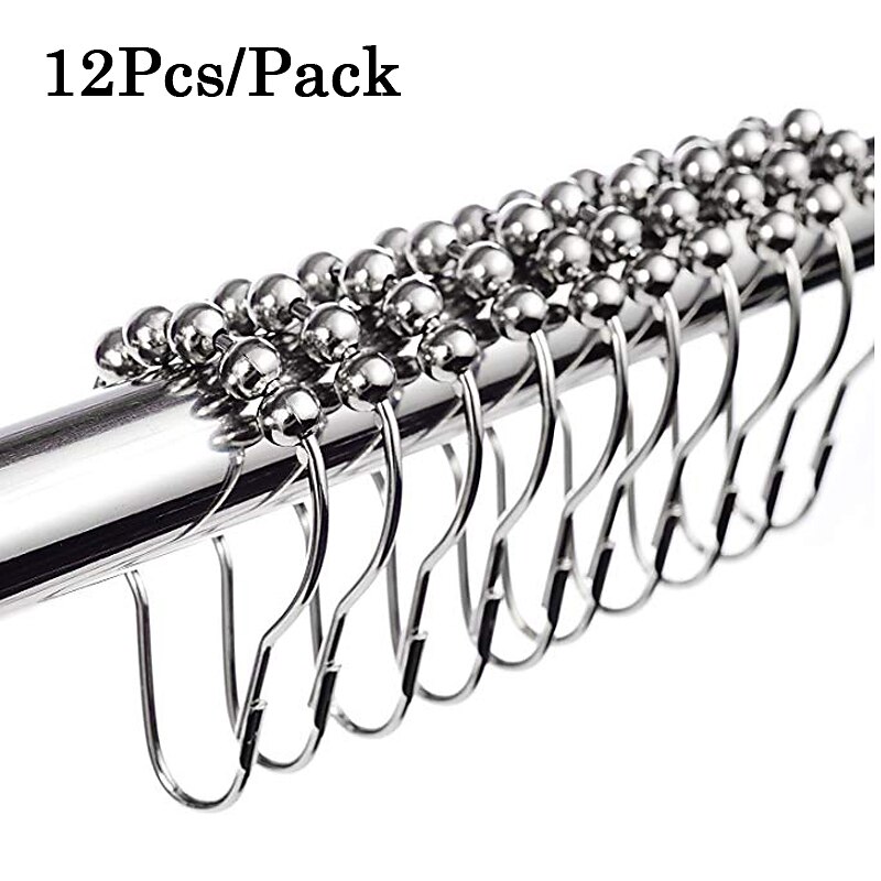 12 pcs Stainless Steel Curtain Hooks Bath Curtain Rollerball Shower Curtain Rings Hooks 5 Rollers Polished Satin Nickel Ball 7