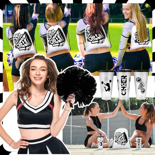 Zhehao 48 Pcs Cheer Gift Bulk for Team Cheerleading Gift Include 12 Plastic Cups with Lid and Straw, Drawstring Bags, Bracelets, Compact Mirrors for Women Party Supplies Banquet(Black)
