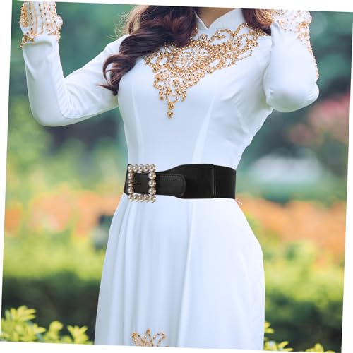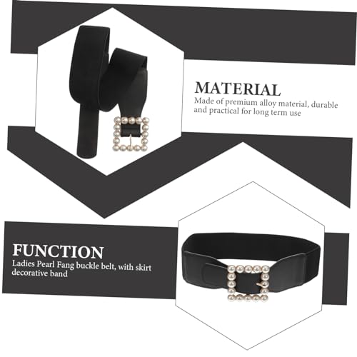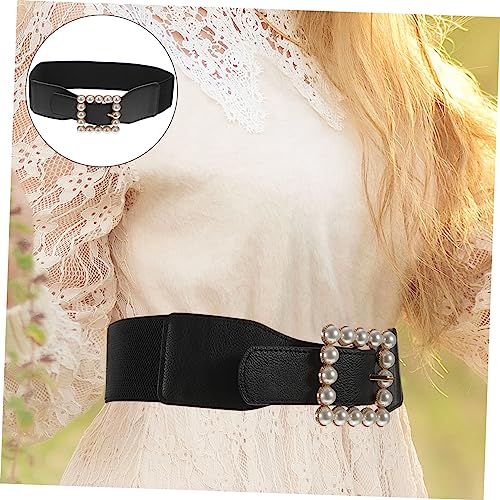 Ladies Elastic Pearl Waistband with Square Buckle Decorative Cummerbund Belt for Dresses and Outfits Black 1