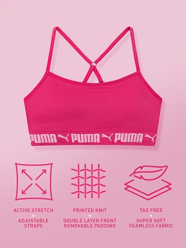 Fabric type: 94% Nylon, 6% SpandexCare instructions: Machine WashOrigin: ImportedClosure type: Pull-OnSTYLE: With a sleek double-layer front and removable cookies, this bra offers customizable coverage and support. Adjustable straps ensure the perfect fit, while the PUMA knitted logo adds a sporty edge. A go-to essential for active days or casual comfort.FEATURES: Crafted with super-soft, seamless fabric for a smooth feel and all-day comfort. Features active stretch for flexible movement, a tag-free design to eliminate irritation, and a double-layer front for extra support. Includes removable cookies for versatile styling.SIZING: Available in sizes Small, Medium, and Large, these bras are designed to provide a secure, plush fit for girls of all shapes. Adjustable straps ensure a personalized fit thatβs perfect for her growing, active lifestyle.MATERIAL AND CARE: Made with 94% Nylon and 6% Spandex, these bras are built for comfort and durability. Machine wash cold on a gentle cycle, tumble dry low, and avoid ironing to keep them looking and feeling great.PUMA has been at the forefront of sport-inspired fashion for decades, blending athletic performance with bold style. Designed to empower the next generation, these bras embody the brandβs commitment to comfort, innovation, and self-expression. Perfect for everyday use. excellent materials and excellent craftsmanship ensure long-lasting durability.