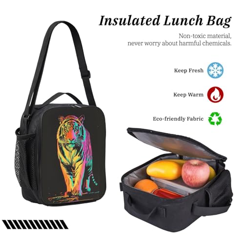 • Reusable lunch bag: three-layer insulated design to keep food fresh. Includes an elastic strap for utensils, one main compartment with 4 inner pockets, a right-side exterior pocket, and an adjustable shoulder strap for easy carrying.