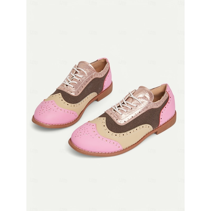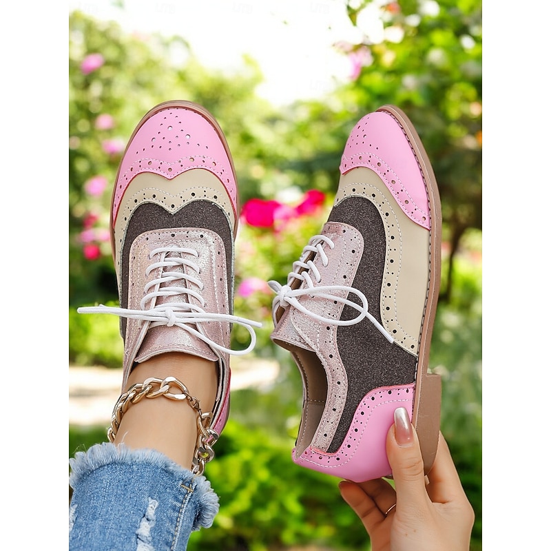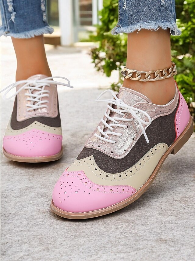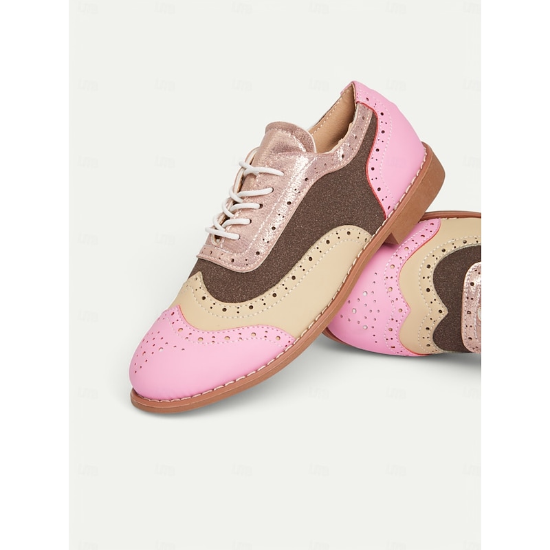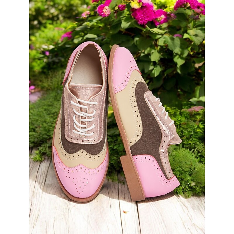 HOT ! Colorful Pink and Beige Brogue Oxford Sneakers for Women, Casual Lace-Up Shoes with Perforated Detailing, Stylish and Comfortable for Everyday Wear