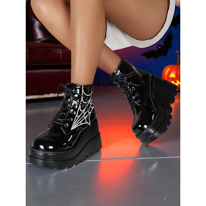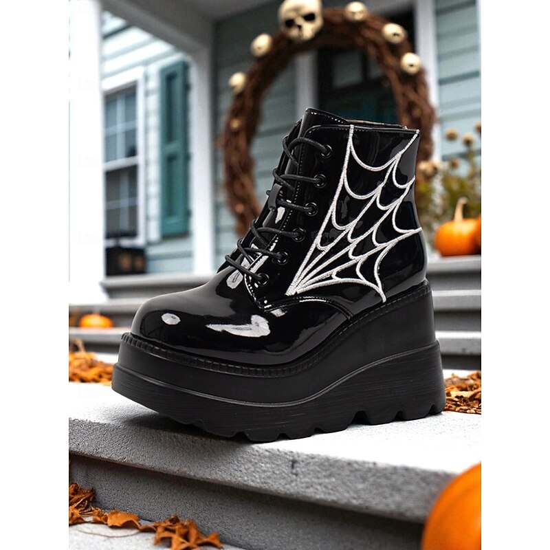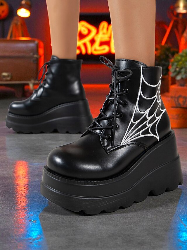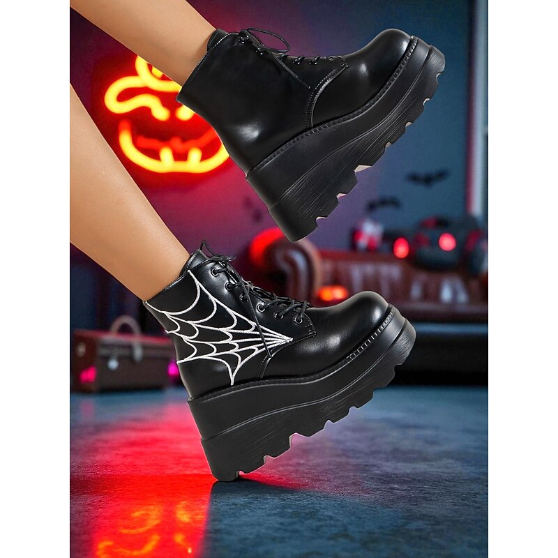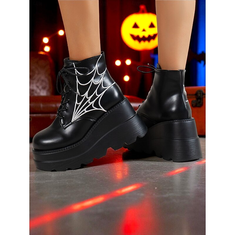 HOT ! Women's Black Platform Boots with Spider Web Design - Chunky Lace-Up Ankle Boots for Halloween, Cosplay, and Masquerade Balls, Punk and Gothic Style, Comfortable for All-Day Wear