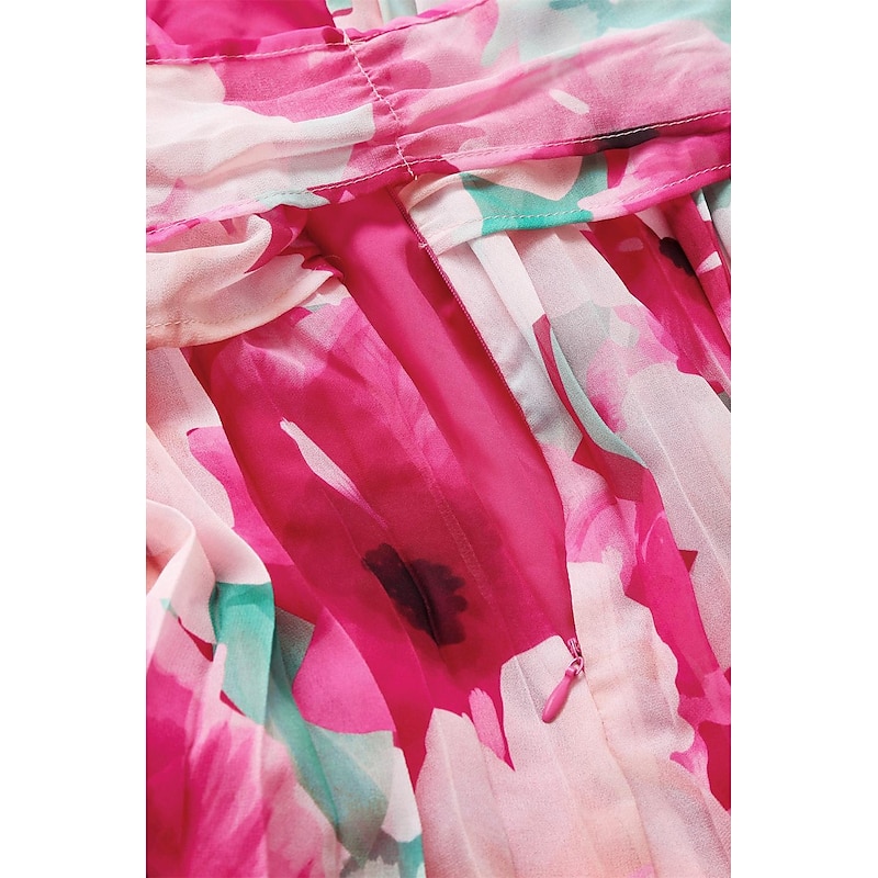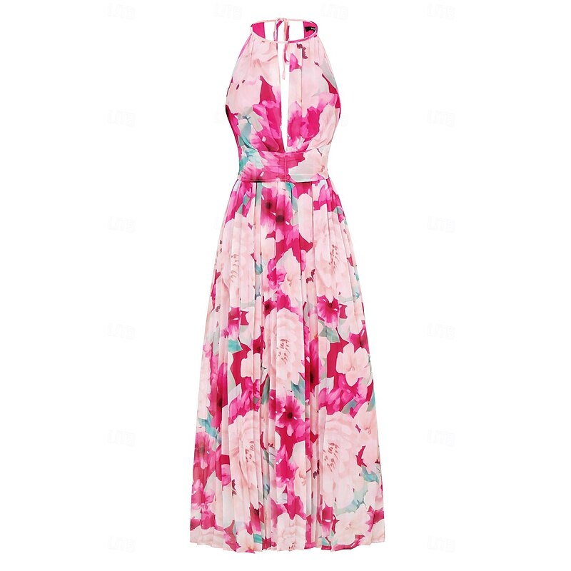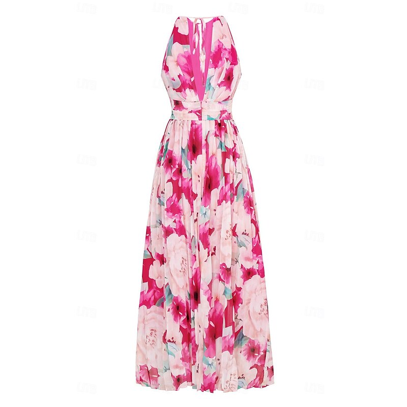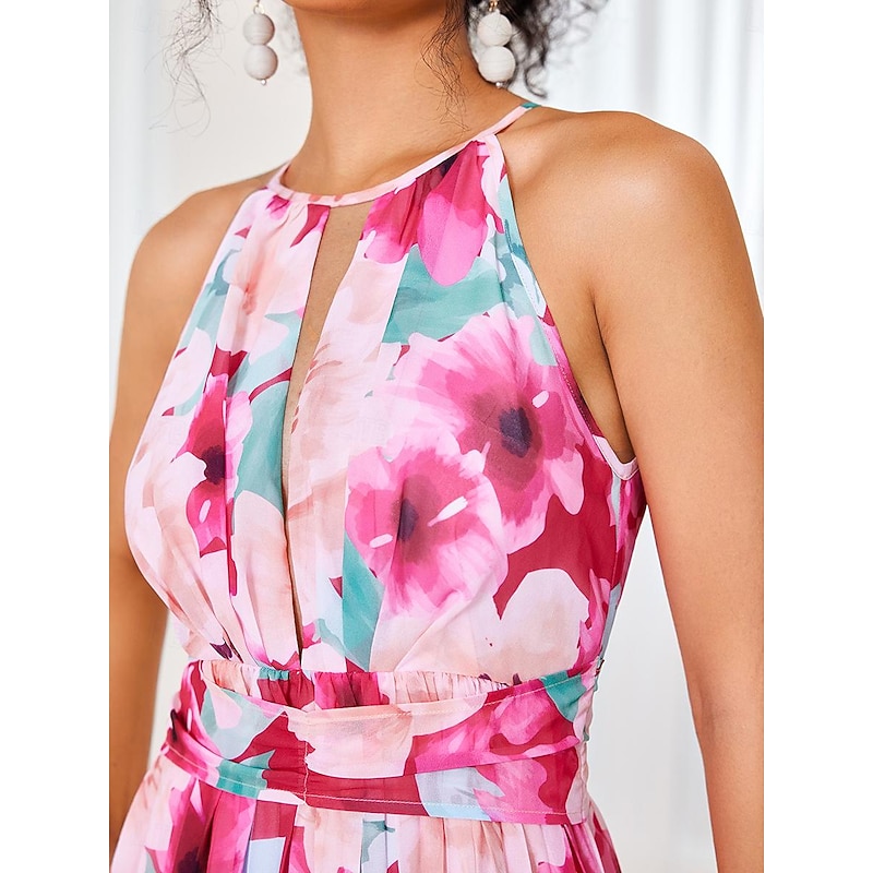 More information about Women's Maxi Dress Sleeveless Halter Neck Floral Pink White Pleated Belted Lightweight Spring Summer Wedding Party Elegant Flowy Full-Length Clothing Apparel