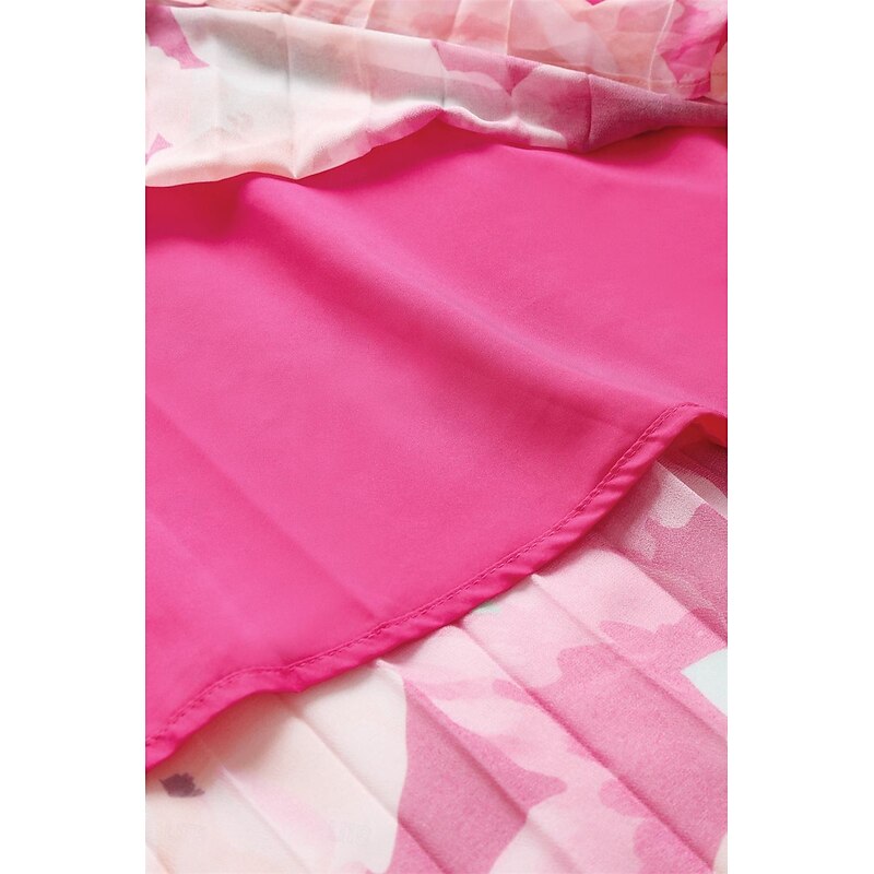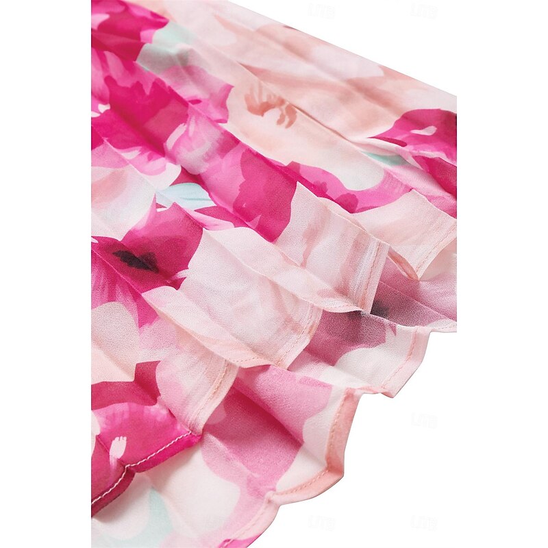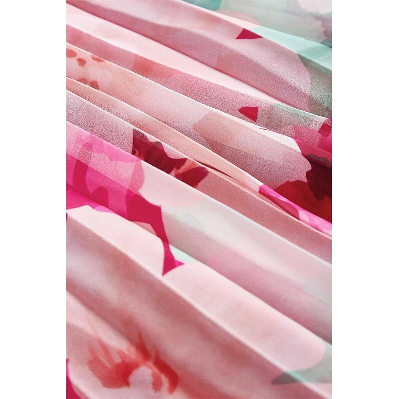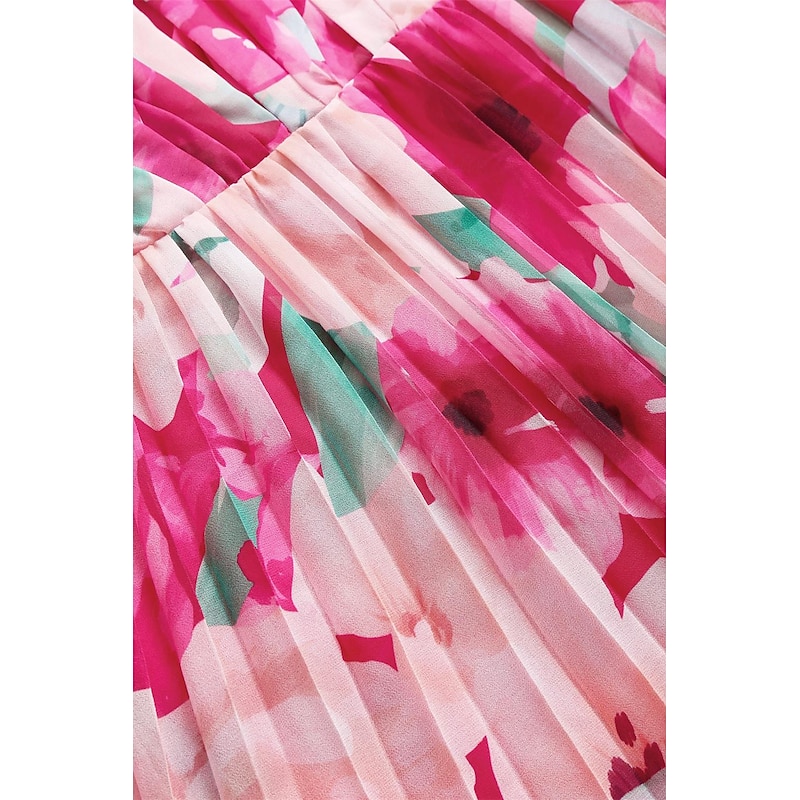Featuring a stylish halter neckline, this dress elegantly draws attention to the shoulders and collarbone. The sleeveless design is perfect for summer, and the vibrant floral print in shades of pink with subtle green hints adds a fresh and romantic touch to the overall look.