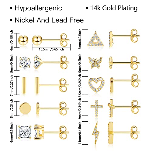 • 10 PAIRS GOLD EARRING SETS FOR MULTIPLE PIERCING: You will get 10 pairs of gold stud earrings for women, including ball, flat pad, bar, square cz, round cz, triangular cz, heart cz, cross cz, lightning cz, butterfly cz. Hypoallergenic stud earrings set is easy and chic. Suitable for any face shape, any occasion and any style of outfits. Dainty and vintage for wearing alone or stacking with other earrings.