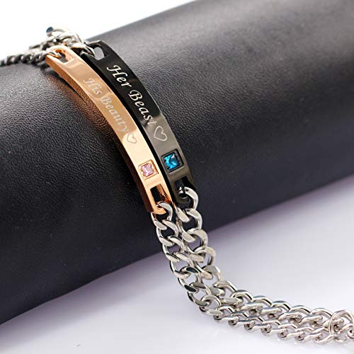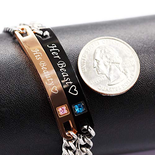 • ♥ Unique design: This charm cool bracelets set is featured as engraving name "Her Beast" & "His Beauty" with blue &white austrian crystal, and plated with balck and gold colors.
