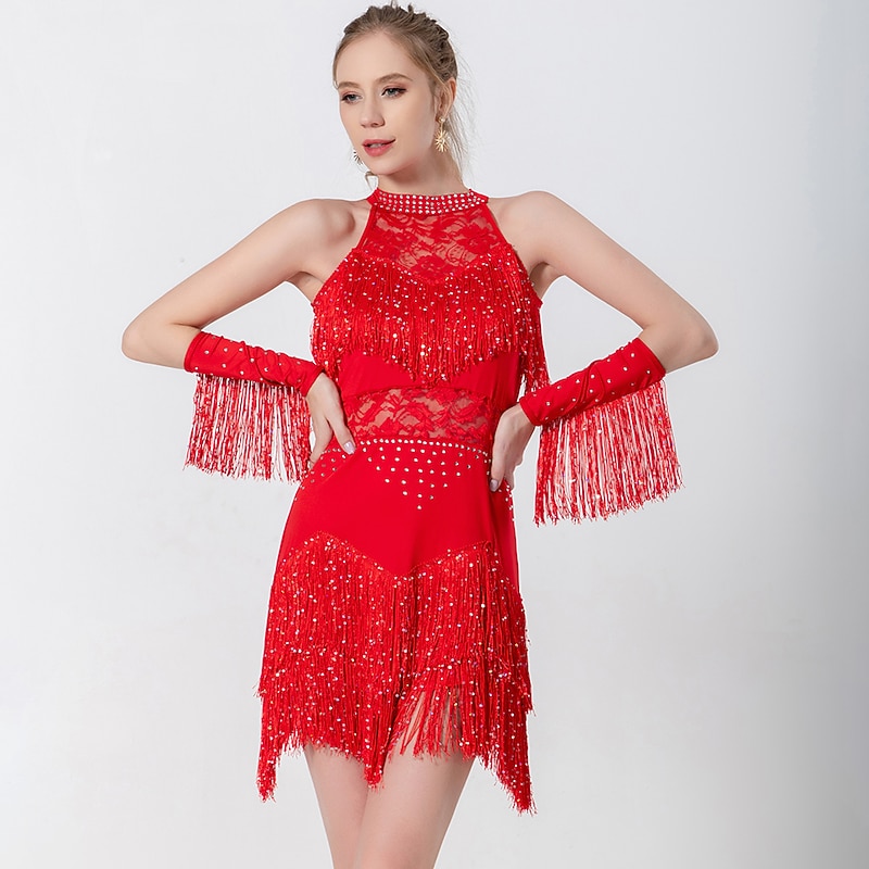 HOT ! Latin Dance Dress Lace Fringed Tassel Ruching Women's Performance Training Sleeveless High Polyester Pink Hobbies