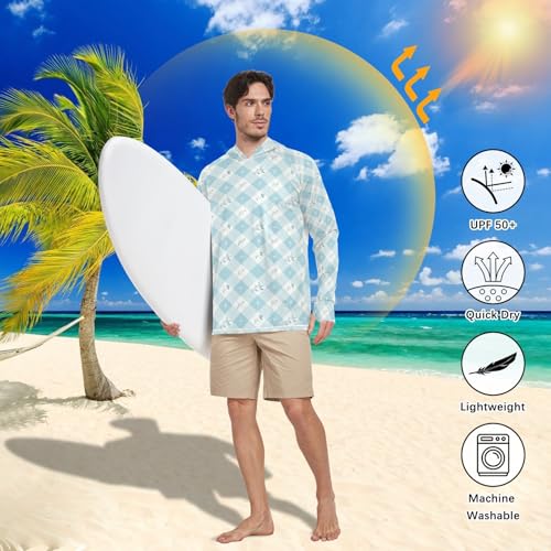 Men Sun Protection Hoodies Long Sleeve UPF 50 + Mens Sun Shirts Fishing Shirt Men UV Rash Guards Teal Gingham Plaid Floral