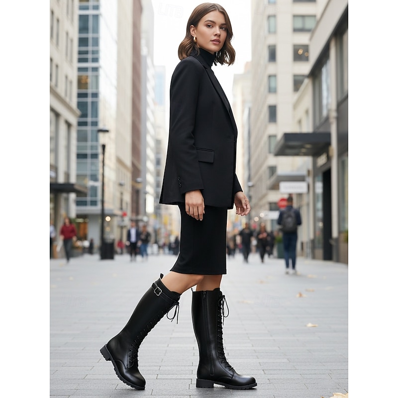 Women's Black Lace-Up Combat Boots with Buckle Detail and Zipper, Rugged Urban Fashion Footwear for Modern Outfits 6