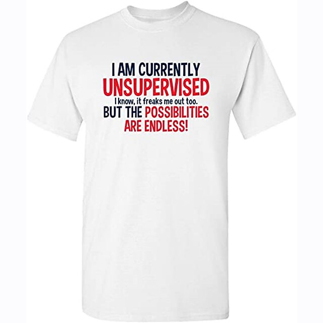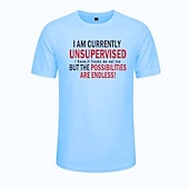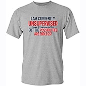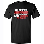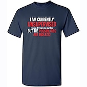 The shirt boasts a bold, humorous slogan on the front, printed in eye-catching red and black lettering on a clean white backdrop: "I AM CURRENTLY UNSUPERVISED I know, it freaks me out too. BUT THE POSSIBILITIES ARE ENDLESS!" This playful graphic adds a unique and fun element to the design, perfect for expressing your personality.