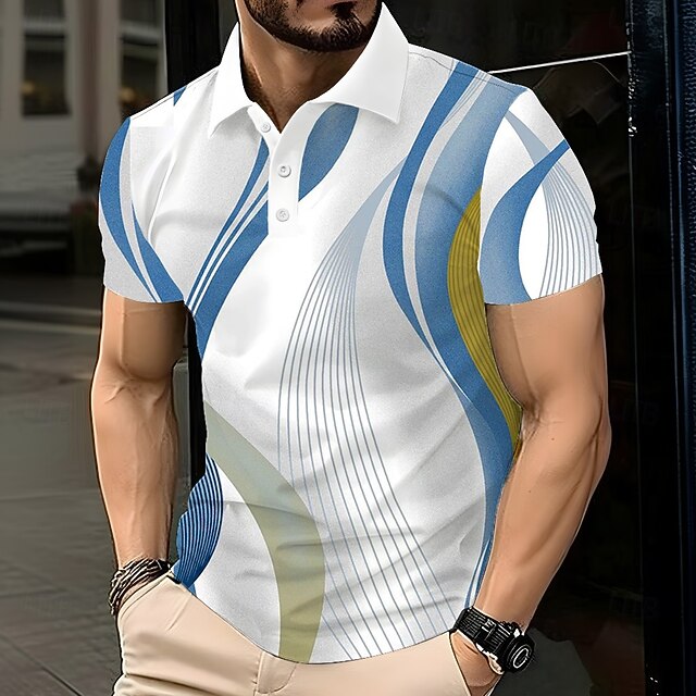 HOT ! Men's Geometic Line Polo Short Sleeve Polo Shirts Lapel Business Casual Business Athleisure 3D Print Buttons Summer Blue Purple Gold