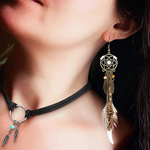 Hicarer 2 Sets Native American Jewelry Set for Women 2 Pieces Faux Suede Choker Necklace Faux Leather Choker and 2 Pairs Bohemian Artificial Feather Earrings Boho Dream Catcher Earring Western Jewelry