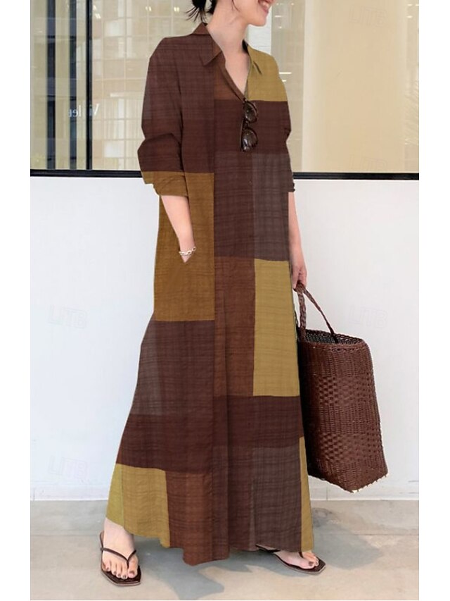 More information about Women's Midi Dress Print Dress Plaid Basic Office Daily Weekend Print Long Sleeve Shirt Collar Dress Loose Fit Brown Spring Fall S M L XL XXL