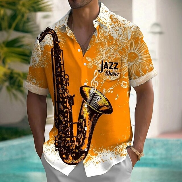 HOT ! Men's Boardmasters Musical Instrument Jazz Shirt Summer Shirt Button Up Shirt Short Sleeve Vintage Retro Outdoor Holiday Summer Spring Turndown 3D Print Collared Shirts Front One Pocket Orange
