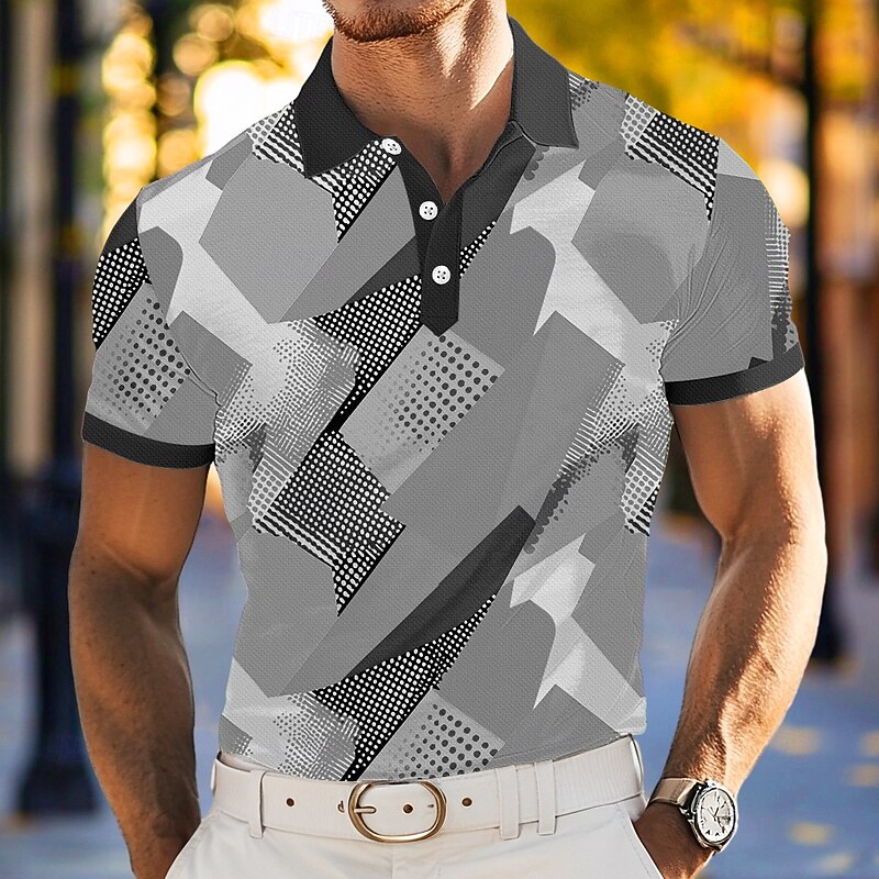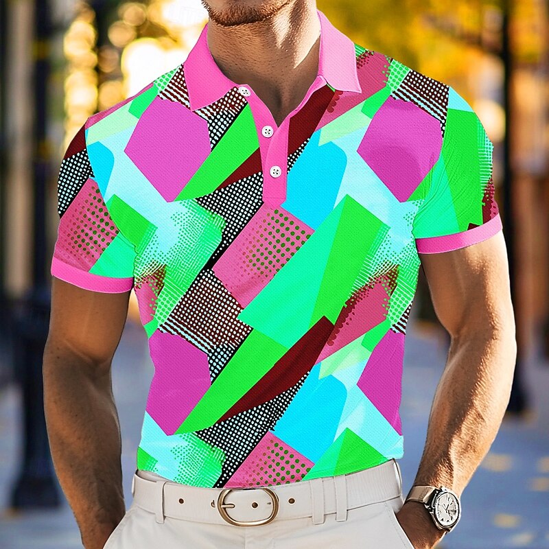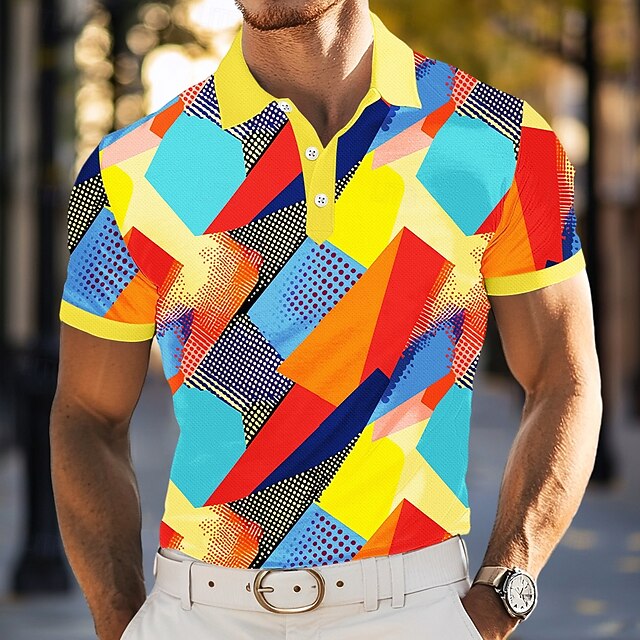 Highlights - Stay cool and stylish this summer with our short sleeve men's polo - Perfect for vacations and casual occasions - Unique geometric and color block patterns for a trendy look - Features a turndown neckline and button design for added flair