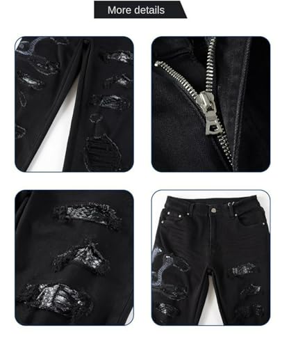 More information about Jeans Pants Trousers Denim Ripped Worn Holes Elastic Tight Personality Embroidered Snake Fold Fringed Black Casual Straight Leg for Men(Black,29)