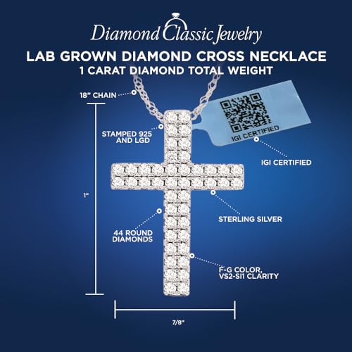 • Lab Grown Diamonds - This cross necklace sparkles with 44, round Lab Grown Diamonds for a total diamond weight of 1 Carat - F-G Color, VS2-SI1 Clarity. Lab Grown Diamonds are real diamonds with advantages over mined diamonds which includes a fine quality with much less investment.